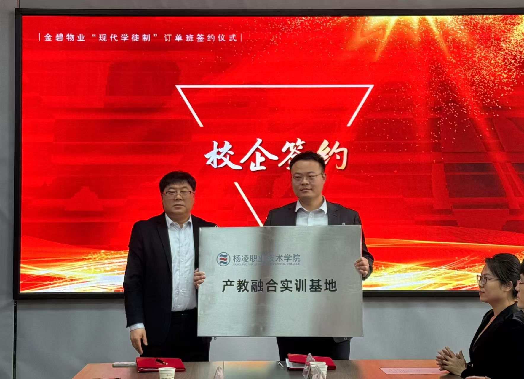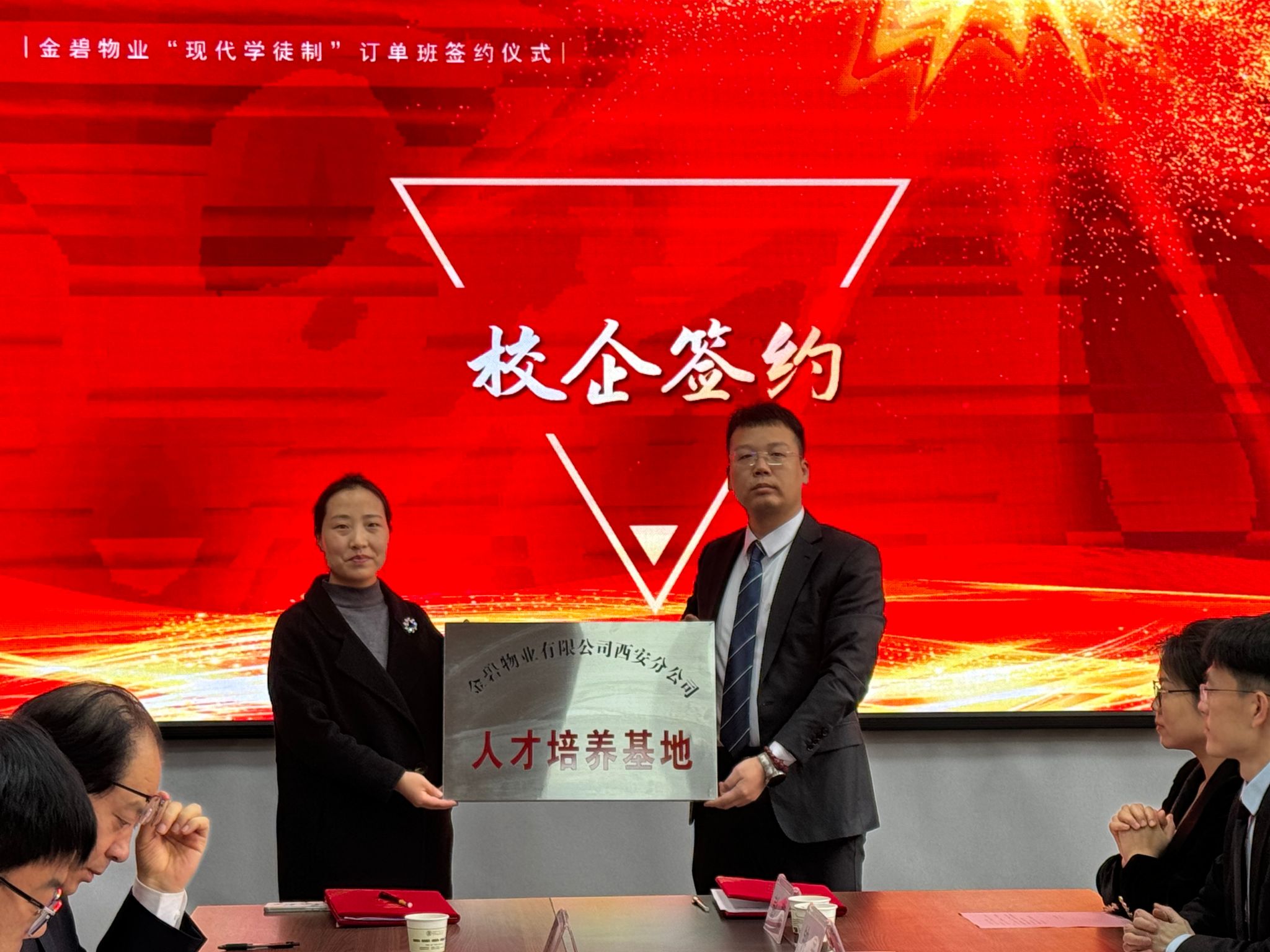 仪式上,双方签订了校企合作协议及金碧物业订单班人才培养协议,企业向学校授予“人才培养基地”牌匾,学校向企业授予“产教融合实训基地”牌匾。
