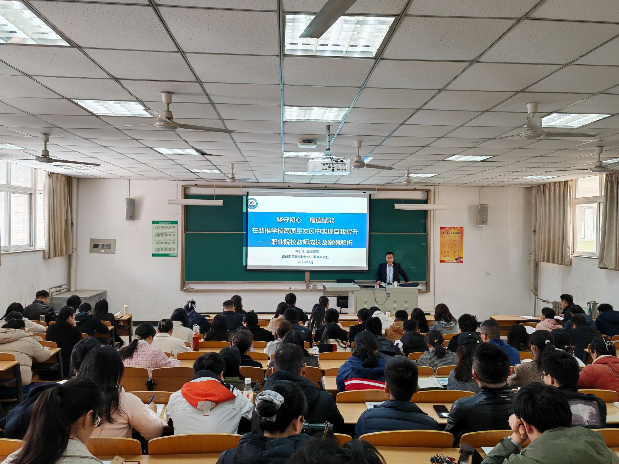 3月28日下午,学校举办青年教师培训会。西安航空职业技术学院教务处处长、双高办主任龚小涛教授作《职业院校教师成长及案例解析》专题报告。150余名教师参加培训。