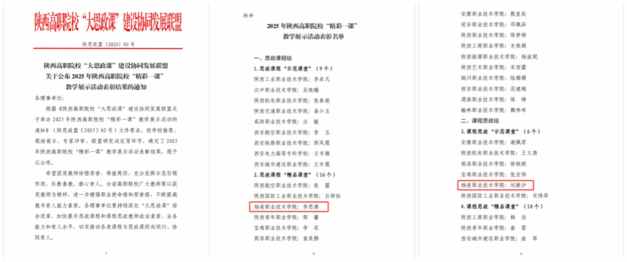 3月29日,陕西高职院校“大思政课”建设协同发展联盟2025年陕西高职院校“精彩一课”教学展示活动在陕西机电职业技术学院举办。beat365官网生物工程学院教师刘颖沙获课程思政“示范课堂”,马克思主义学院教师李思源获思政课程“精品课堂”。