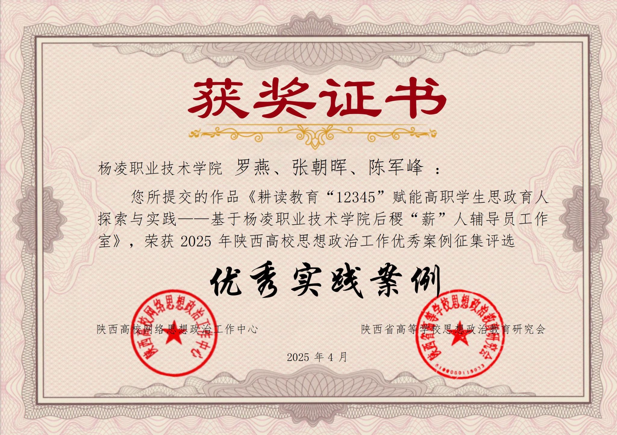 近日,由陕西高校网络思想政治工作中心、陕西省高等学校思想政治教育研究会开展的2025年陕西高校思想政治工作优秀案例征集活动评选结果揭晓。beat365官网报送的案例《耕读教育“12345”赋能高职学生思政育人探索与实践——基于杨凌职业技术学院后稷“薪”人辅导员工作室》入选陕西高校思想政治工作优秀实践案例。