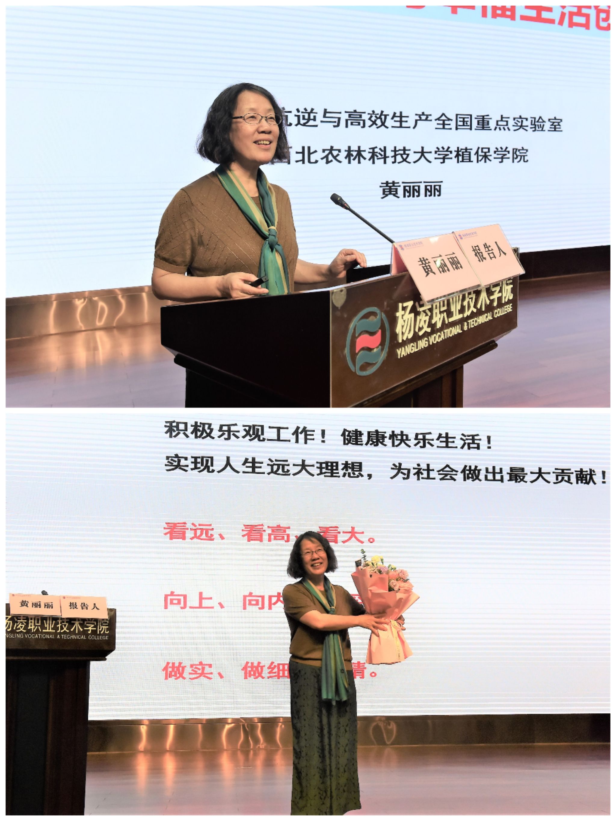 报告会现场,黄丽丽以《教学科研创新与幸福生活创造》为题,回顾了自己长期致力于果树重大虫害防控理论和技术方面的研究工作的奋斗历程,用质朴的语言和感人的事例,生动诠释了科学家精神、教育家精神的深刻内涵,鼓励大家求真致用,将个人兴趣、科研追求与国家需求相结合,将艰苦奋斗、爱岗敬业、守正创新、育人传承、淡泊名利、甘于奉献的精神内化于心、外化于行,在持之以恒的奋斗中实现人生价值。王武以《以匠心致初心——劳模精神照亮前行路》为题,向大家分享了自己的奋斗历程,激励大家要艰苦奋斗、敢为人先,不忘初心、砥砺前行。