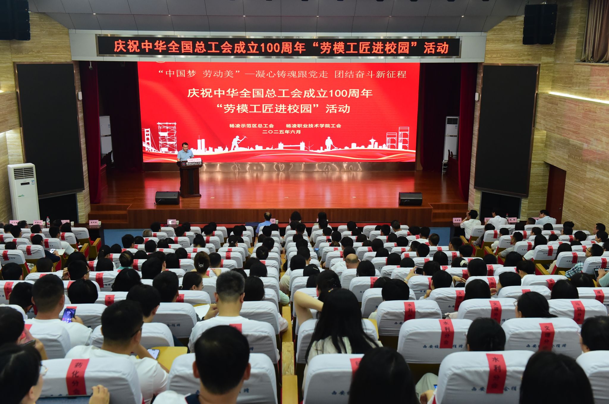 6月9日,由杨凌示范区总工会和学校工会共同举办的“中国梦 劳动美——凝心铸魂跟党走 团结奋斗新征程”庆祝中华全国总工会成立100周年“劳模工匠进校园”活动在beat365官网举办。活动邀请了全国先进工作者黄丽丽、全国五一劳动奖章获得者王武为学校教职工作劳模精神专题报告。校党委书记韩明军、校长仲伟周活动前会见了两位劳模工匠。活动由党委副书记、纪委书记王勇胜主持。400余名教职工聆听了报告。