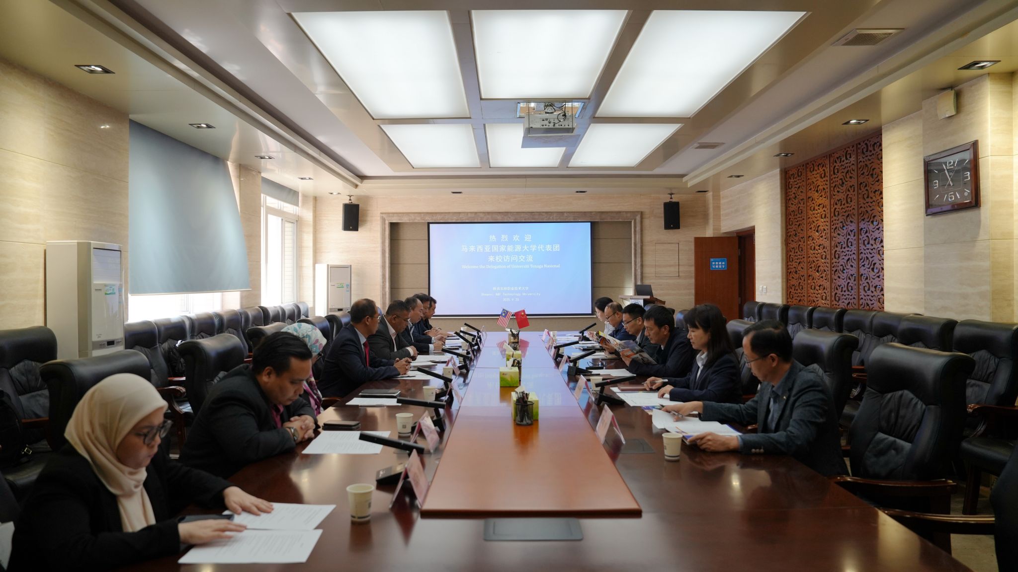 9月25日,马来西亚国家能源大学(Universiti Tenaga Nasional)校长赫鲁尔·萨勒赫·穆罕默德·萨哈里教授(Prof. Ir. Dr. Khairul Salleh Mohamed Sahari)、西安丝路博创科技有限公司总经理李保桥一行8人来校考察交流。副校长蒋平江出席座谈并讲话。
