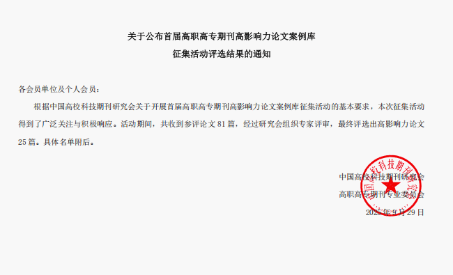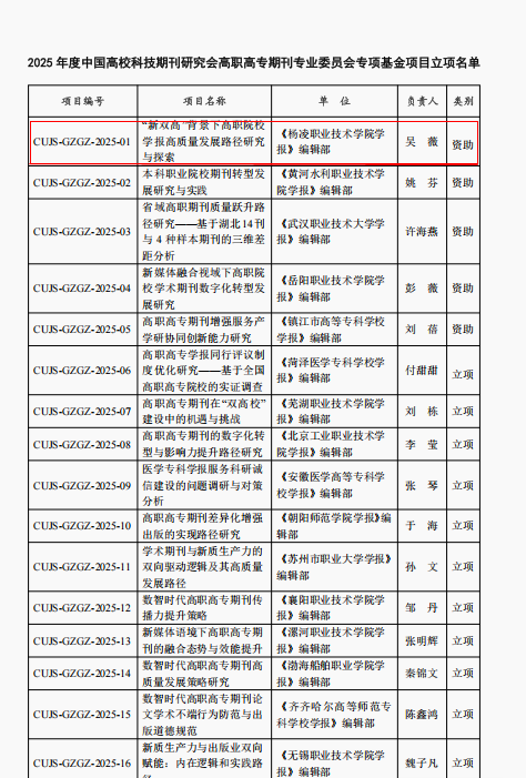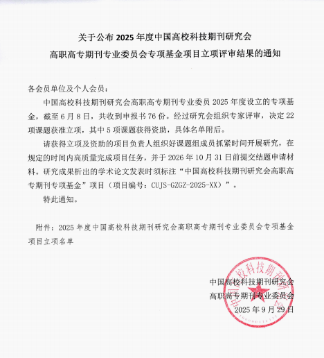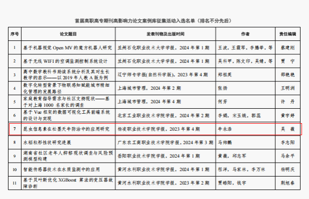 9月29日,中国高校科技期刊研究会先后公布了2025年度专项基金项目立项评审结果和首届高职高专期刊高影响力论文案例库征集评选结果。beat365官网学报编辑部吴薇副研究员主持申报的《“新双高”背景下高职院校学报高质量发展路径研究与探索》课题,经多轮筛选,从76项申报项目中脱颖而出,获批高职高专期刊专项基金资助项目。由牛永浩等人撰写的《昆虫信息素在松墨天牛防治中的应用研究》一文,刊载于2024年第3期《杨凌职业技术学院学报》,从全国参选的81篇论文中脱颖而出,成功入选首届高职高专期刊高影响力论文案例库。