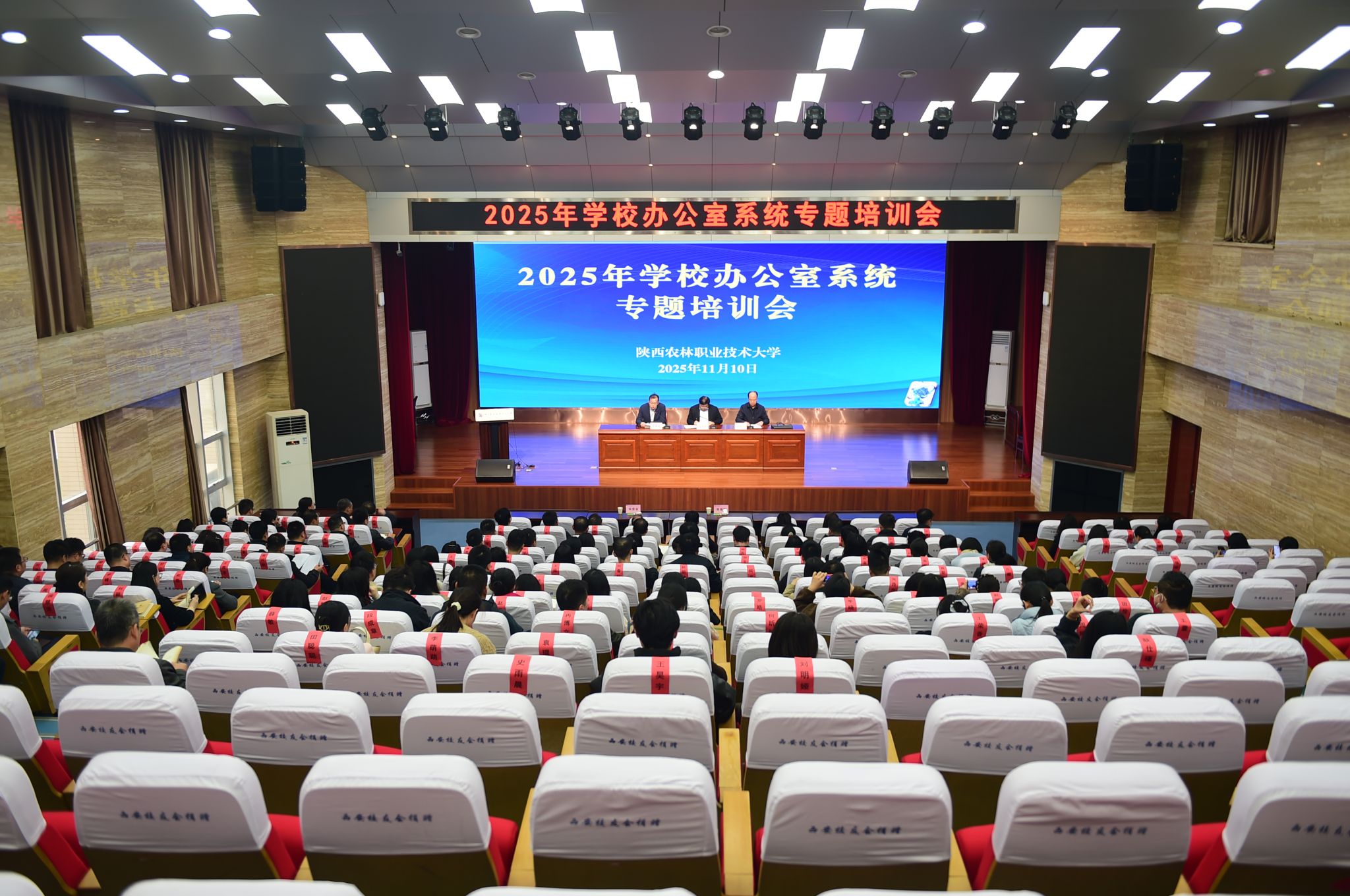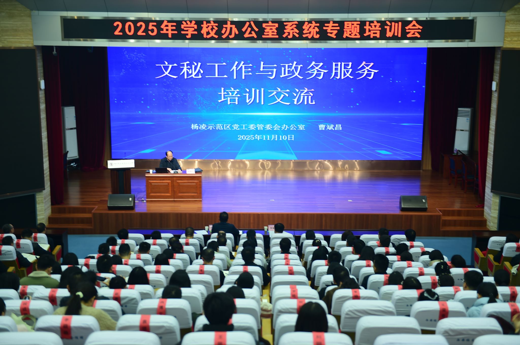11月10日下午,学校在思辨堂举办2025年办公室系统专题培训会。校党委副书记刘瑞明、杨凌示范区党工委管委会办公室副主任曹斌昌出席。党委(校长)办公室负责人、全体科级干部、辅导员和党委(校长)办公室全体人员参加培训。