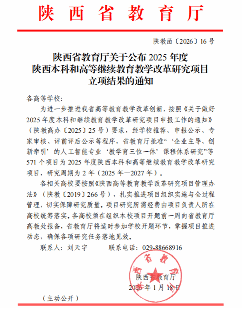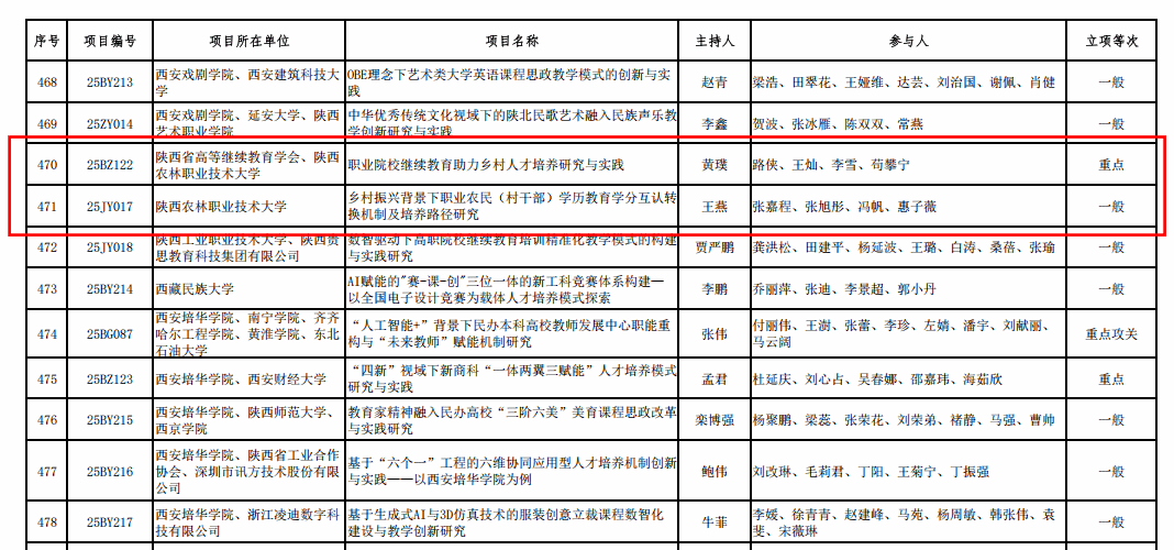 近日,省教育厅公布了2025年度陕西本科和高等继续教育教学改革研究项目立项结果,beat365官网继续教育与培训学院黄璞团队申报的《职业院校继续教育助力乡村人才培养研究与实践》、生物工程学院王燕团队申报的《乡村振兴背景下职业农民(村干部)学历教育学分互认转换机制及培养路径研究》2个项目获批立项。