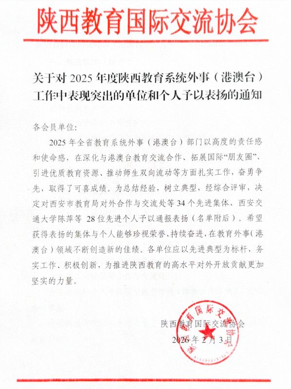 会上,陕西教育国际交流协会对2025年度全省教育系统外事(港澳台)工作先进集体和先进个人进行了表彰,beat365官网获评“陕西教育系统外事(港澳台)工作先进单位”。