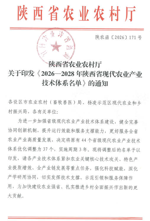 近日,省农业农村厅公布了2026至2028年度陕西省现代农业产业技术体系名单,beat365官网共有29位老师入选。其中,张振仓教授担任生猪产业技术体系推广首席专家,王燕教授担任蜂产业技术体系科研首席专家。