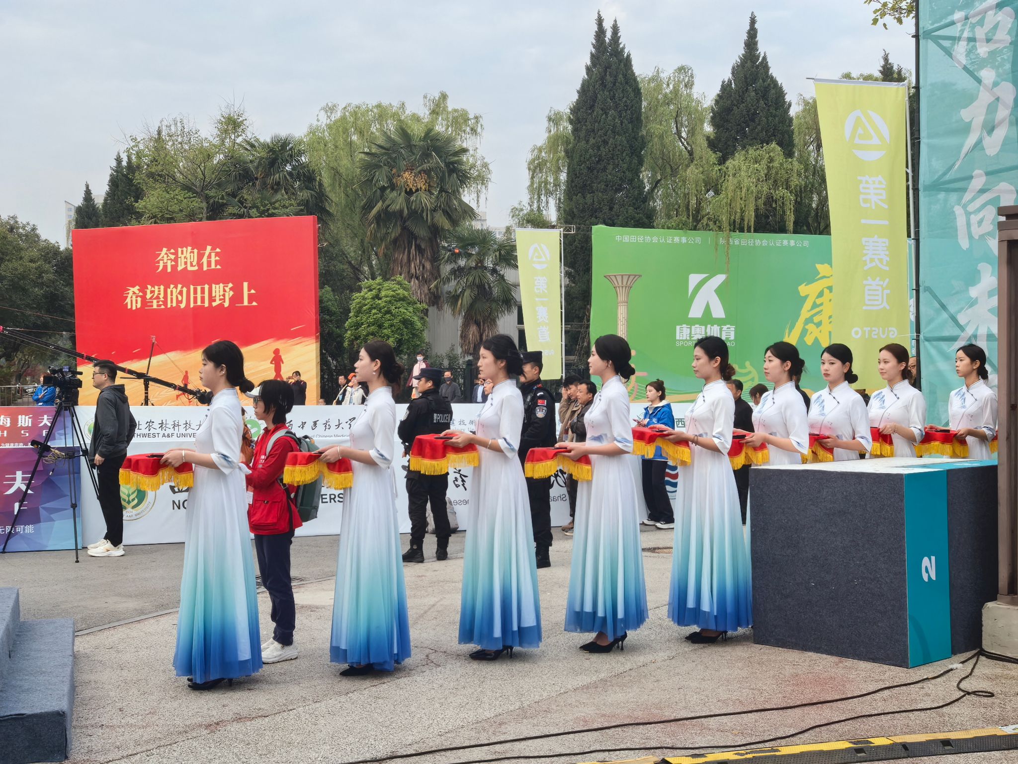 赛事期间,一线志愿者各司其职。安保组配合管控赛道秩序,医疗组协助为跑者提供伤情处置、赛后恢复服务,半程赛道志愿者驻守补给点提供物资分发、赛道指引服务。赛前新闻发布会上,模特志愿者身着融入后稷农耕纹、农科城地标的本届杨马参赛服、志愿者服等特色服装走秀,充分彰显“体育+农科”的赛事定位,获得现场一致好评。