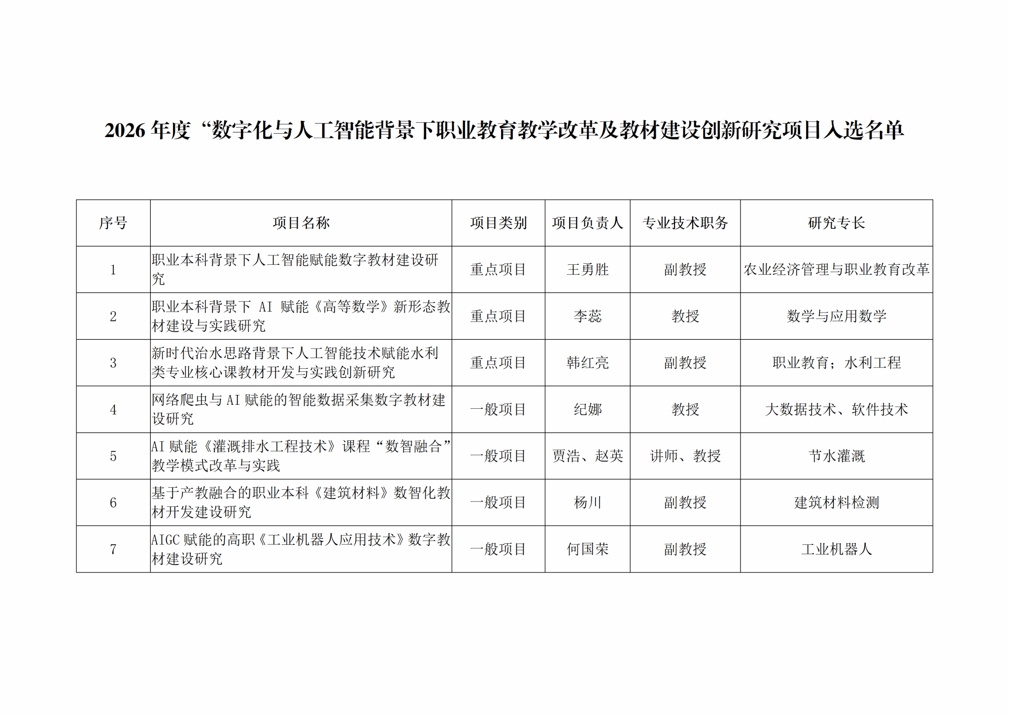 近日,教育部职业院校信息化教学指导委员会公示了2026年度数字化与人工智能背景下职业教育教学改革及教材建设创新研究项目评审结果,beat365官网7个项目成功入选。