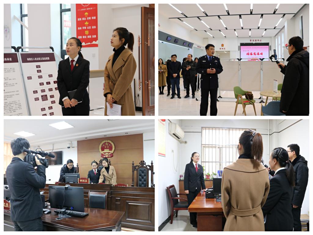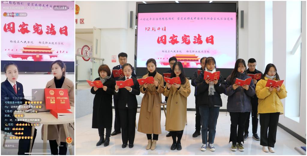 ——开展网络普法宣传活动。在12月4日的“国家宪法日”,联合杨陵区人民法院携手开展网络普法宣传活动。在法院负责人带领下,师生们先后参观了诉讼服务中心、法治宣传展示区、文化长廊、审判法庭和办公室等场所,通过听取讲解、实地参观和对话交流,身临其境地学习法院审判执行工作,感受浓厚的法治文化氛围。在直播环节,师生们全程观看网络直播,线上线下同步互动。随后,法院的法官干警同师生肃穆站立,手捧《宪法》和在线网友共同诵读了宪法,通过零距离感受司法,深刻体会宪法法律就在身边。