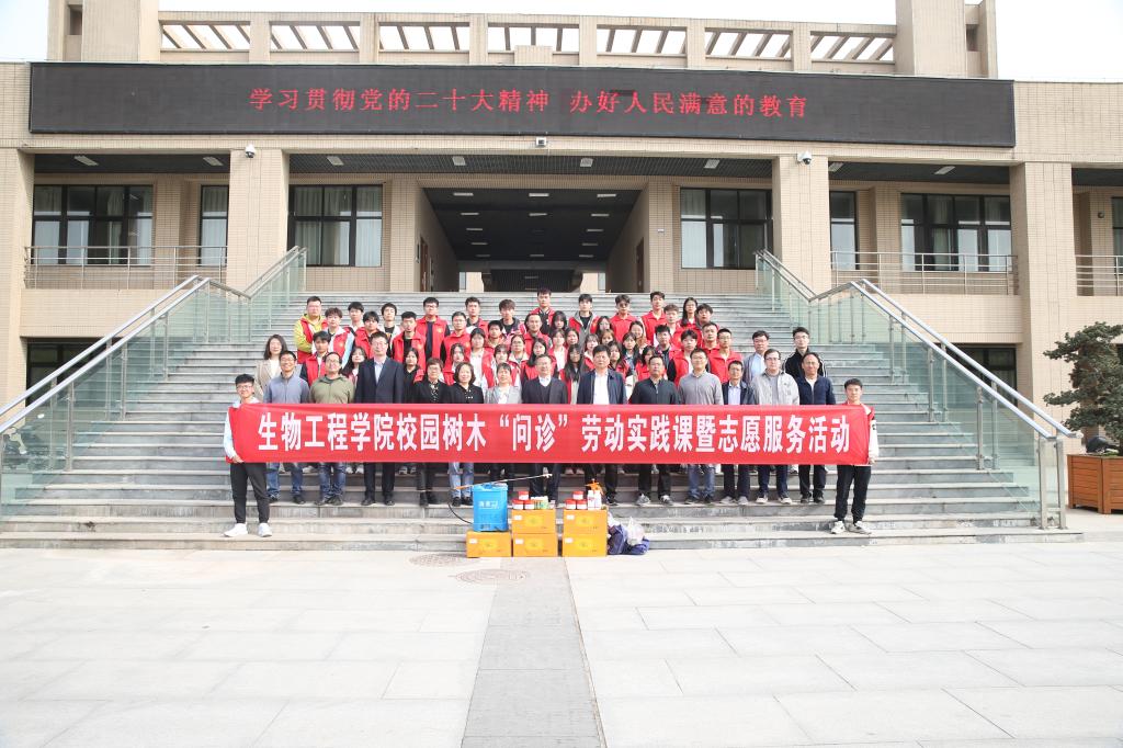4月12日,生物工程学院结合涉农专业特色开展校园树木“问诊”劳动实践课暨志愿服务活动。副校长张朝晖,党委学工部部长陈军峰、后勤保障处副处长王锋、生物工程学院党总支书记陈吼植保教研室、园艺教研室6位专家教授及40学生志愿者参加启动仪式。