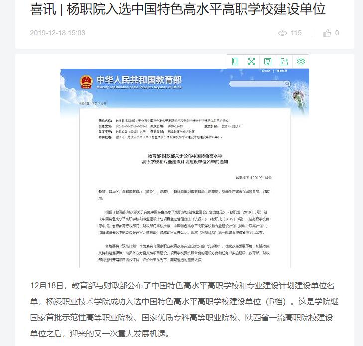 12月18日,教育部与财政部公布了中国特色高水平高职学校和专业建设计划建设单位名单,杨凌职业技术学院成功入选中国特色高水平高职学校建设单位(B档)。这是学院继国家首批示范性高等职业院校、国家优质专科高等职业院校、陕西省一流高职院校建设单位之后,迎来的又一次重大发展机遇。