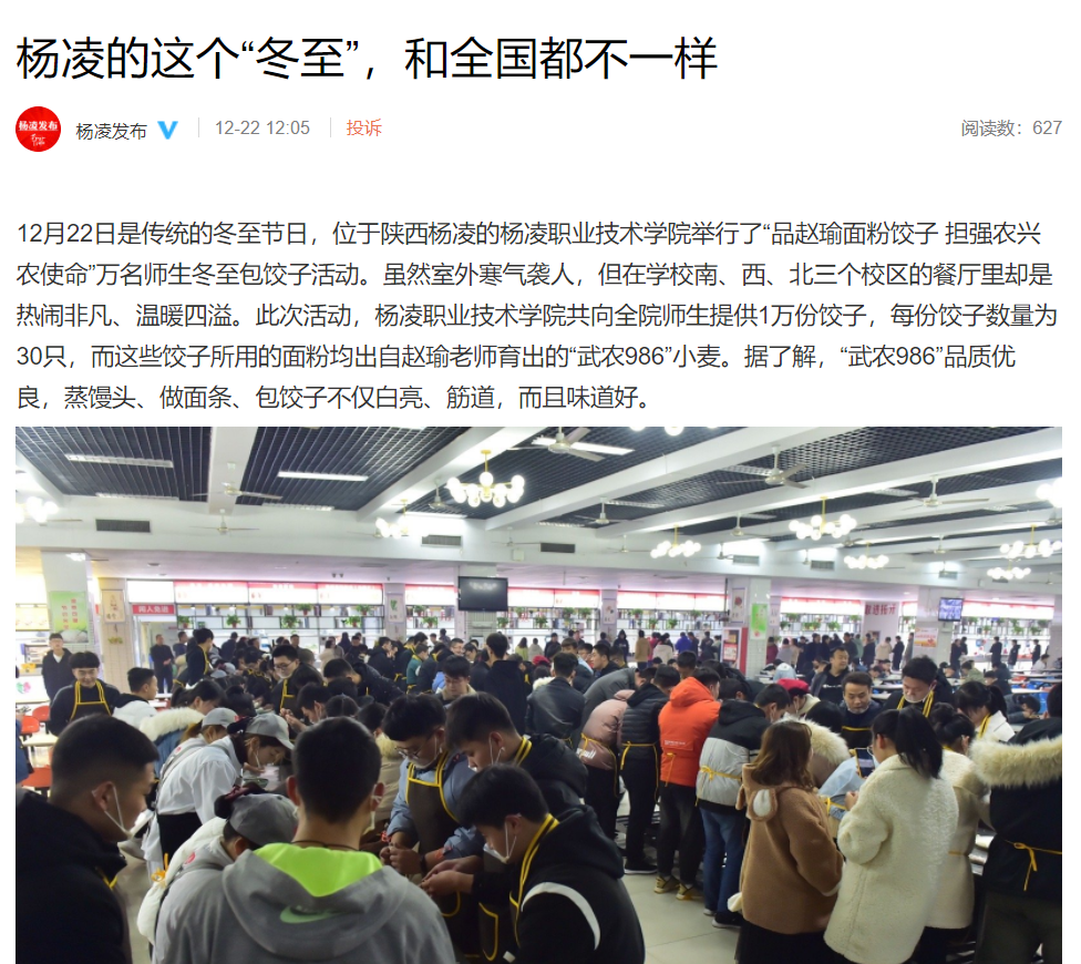 12月22日是传统的冬至节日,位于陕西杨凌的杨凌职业技术学院举行了“品赵瑜面粉饺子 担强农兴农使命”万名师生冬至包饺子活动。虽然室外寒气袭人,但在学校南、西、北三个校区的餐厅里却是热闹非凡、温暖四溢。此次活动,杨凌职业技术学院共向全院师生提供1万份饺子,每份饺子数量为30只,而这些饺子所用的面粉均出自赵瑜老师育出的“武农986”小麦。据了解,“武农986”品质优良,蒸馒头、做面条、包饺子不仅白亮、筋道,而且味道好。
