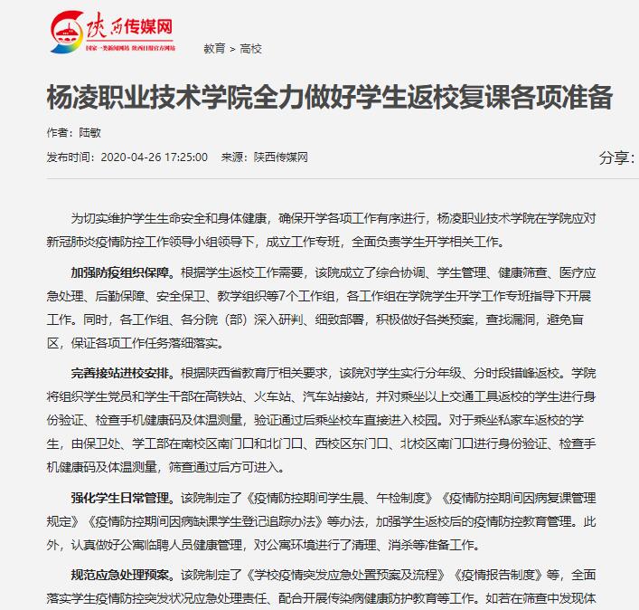 为切实维护学生生命安全和身体健康,确保开学各项工作有序进行,杨凌职业技术学院在学院应对新冠肺炎疫情防控工作领导小组领导下,成立工作专班,全面负责学生开学相关工作。