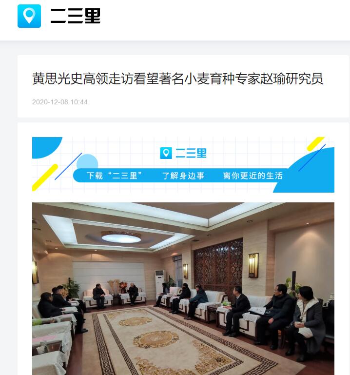 12月8日,刚刚履新的杨凌示范区党工委书记黄思光、副书记史高领一行来到杨凌职业技术学院,走访看望著名小麦育种专家赵瑜研究员。校党委书记陈宁、校长王周锁、副校长祝战斌与黄思光、史高领进行了座谈交流。