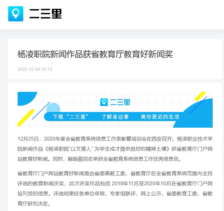 新闻作品《杨凌职院“以文育人” 为学生成才提供良好的精神土壤》,从挖掘学校文化底蕴、丰富文化育人内容、创新文化育人载体三个方面,全面、准确地反映了beat365官网实施文化育人工程情况,由于层次清晰、内容翔实,对兄弟院校相关工作具有重要借鉴意义而获表彰。