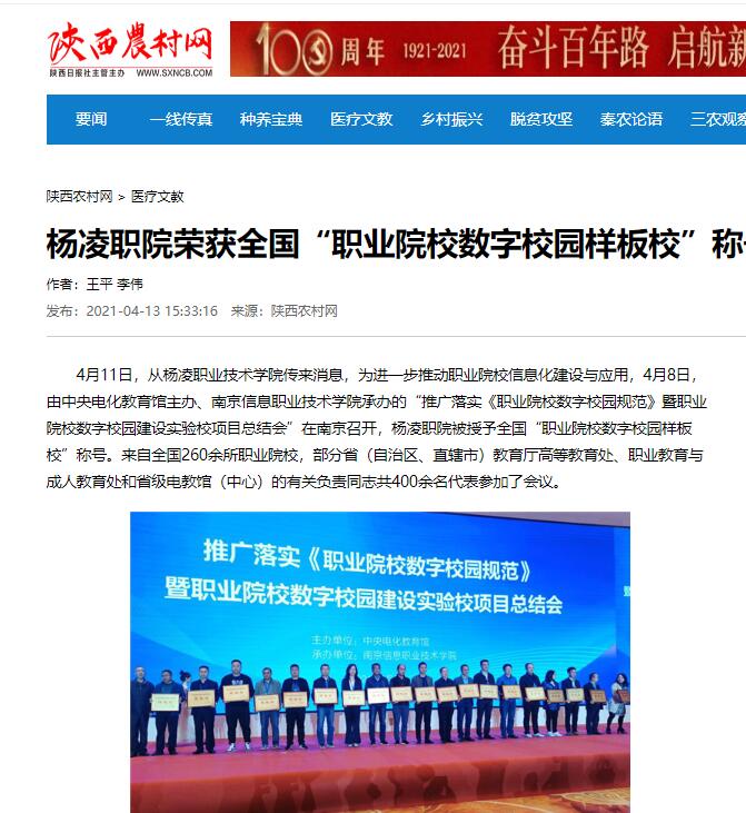 4月11日,从杨凌职业技术学院传来消息,为进一步推动职业院校信息化建设与应用,4月8日,由中央电化教育馆主办、南京信息职业技术学院承办的“推广落实《职业院校数字校园规范》暨职业院校数字校园建设实验校项目总结会”在南京召开,杨凌职院被授予全国“职业院校数字校园样板校”称号。来自全国260余所职业院校,部分省(自治区、直辖市)教育厅高等教育处、职业教育与成人教育处和省级电教馆(中心)的有关负责同志共400余名代表参加了会议。