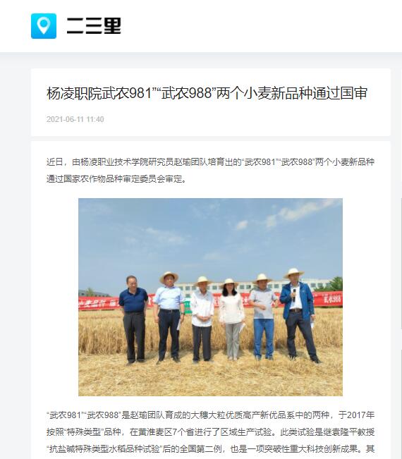 近日,由杨凌职业技术学院研究员赵瑜团队培育出的“武农981”“武农988”两个小麦新品种通过国家农作物品种审定委员会审定。