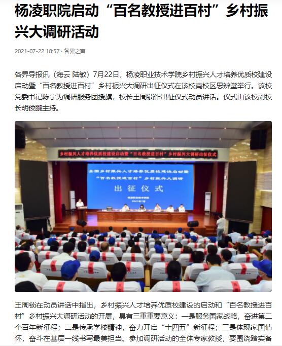 各界导报讯(海云 陆敏)7月22日,杨凌职业技术学院乡村振兴人才培养优质校建设启动暨“百名教授进百村”乡村振兴大调研出征仪式在该校南校区思辨堂举行。该校党委书记陈宁为调研服务团授旗,校长王周锁作出征仪式动员讲话。仪式由该校副校长胡俊鹏主持。