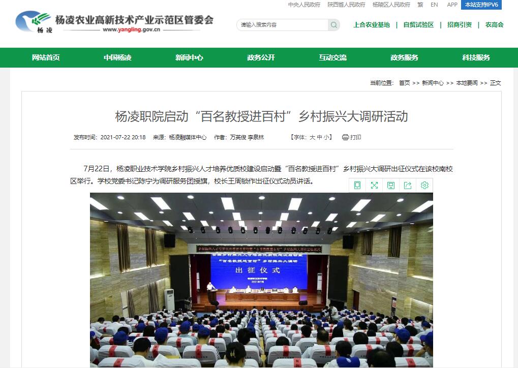 7月22日,杨凌职业技术学院乡村振兴人才培养优质校建设启动暨“百名教授进百村”乡村振兴大调研出征仪式在该校南校区举行。学校党委书记陈宁为调研服务团授旗,校长王周锁作出征仪式动员讲话。