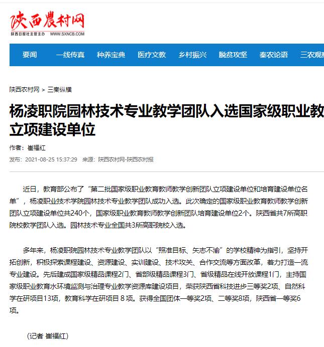 近日,教育部公布了“第二批国家级职业教育教师教学创新团队立项建设单位和培育建设单位名单”,杨凌职业技术学院园林技术专业教学团队成功入选。此次确定的国家级职业教育教师教学创新团队立项建设单位共240个,国家级职业教育教师教学创新团队培育建设单位2个。陕西省共7所高职院校教学团队入选。园林技术专业全国共3所高职院校入选。
