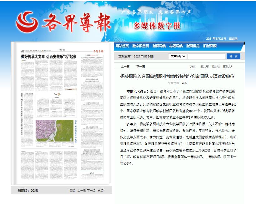 本报讯(海云)近日,教育部公布了“第二批国家级职业教育教师教学创新团队立项建设单位和培育建设单位名单”,杨凌职业技术学院园林技术专业教学团队成功入选。此次确定的国家级职业教育教师教学创新团队立项建设单位共240个,国家级职业教育教师教学创新团队培育建设单位2个。陕西省共有7所高职院校教学团队入选。其中,园林技术专业全国共有3所高职院校入选。