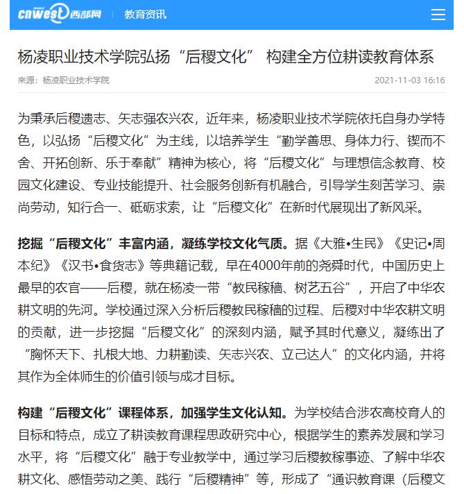 【西部网】杨凌职业技术学院弘扬“后稷文化” 构建全方位耕读教育体系