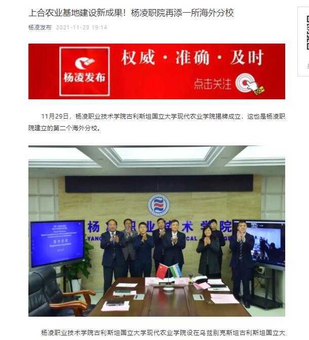 11月29日,杨凌职业技术学院古利斯坦国立大学现代农业学院揭牌成立,这也是杨凌职院建立的第二个海外分校。
