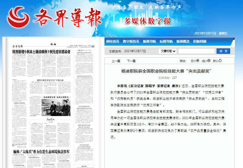 本报讯(实习记者 陈昭宇 首席记者 唐冰)近日,全国职业院校技能大赛执行委员会公布了2021年全国职业院校技能大赛“突出贡献奖”“优秀工作者”和“优秀裁判员”获奖名单,杨凌职业技术学院荣获“突出贡献奖”,生物工程学院副院长王燕获评“优秀工作者”。