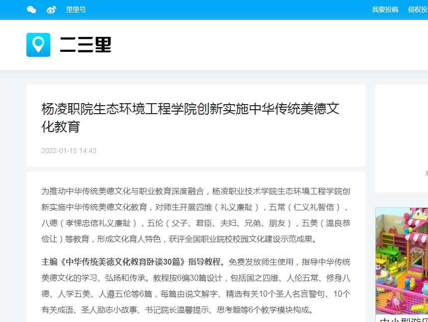 为推动中华传统美德文化与职业教育深度融合,杨凌职业技术学院生态环境工程学院创新实施中华传统美德文化教育,对师生开展四维(礼义廉耻),五常(仁义礼智信),八德(孝悌忠信礼义廉耻),五伦(父子、君臣、夫妇、兄弟、朋友),五美(温良恭俭让)等教育,形成文化育人特色,获评全国职业院校校园文化建设示范成果。