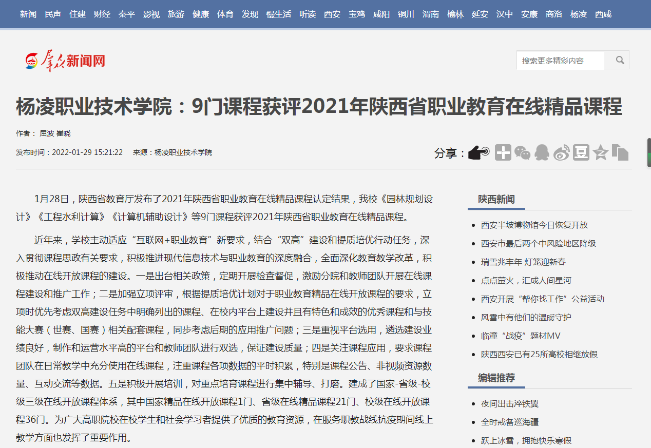1月28日,陕西省教育厅发布了2021年陕西省职业教育在线精品课程认定结果,beat365官网《园林规划设计》《工程水利计算》《计算机辅助设计》等9门课程获评2021年陕西省职业教育在线精品课程。