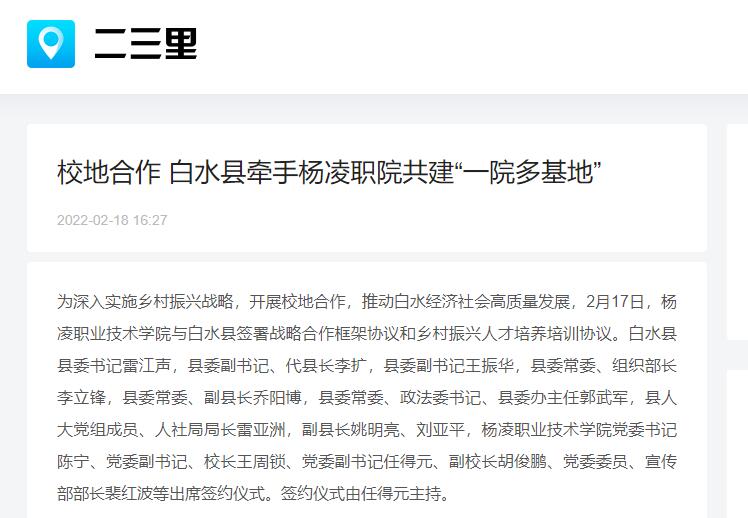 为深入实施乡村振兴战略,开展校地合作,推动白水经济社会高质量发展,2月17日,杨凌职业技术学院与白水县签署战略合作框架协议和乡村振兴人才培养培训协议。白水县县委书记雷江声,县委副书记、代县长李扩,县委副书记王振华,县委常委、组织部长李立锋,县委常委、副县长乔阳博,县委常委、政法委书记、县委办主任郭武军,县人大党组成员、人社局局长雷亚洲,副县长姚明亮、刘亚平,杨凌职业技术学院党委书记陈宁、党委副书记、校长王周锁、党委副书记任得元、副校长胡俊鹏、党委委员、宣传部部长裴红波等出席签约仪式。签约仪式由任得元主持。