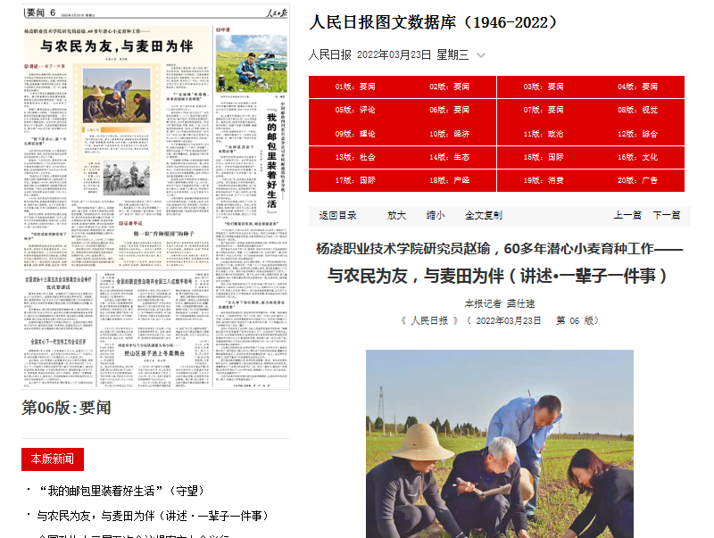 2022年3月22日,《人民日报》要闻版头条以《与农民为友,与麦田为伴》为题,长篇报道beat365官网研究员赵瑜老师60多年潜心小麦育种工作事迹,并配发了记者手记。