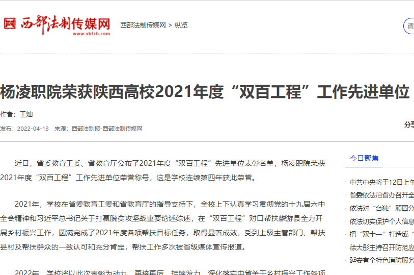 近日,省委教育工委、省教育厅公布了2021年度“双百工程”先进单位表彰名单,杨凌职院荣获2021年度“双百工程”工作先进单位荣誉称号,这是学校连续第四年获此荣誉。