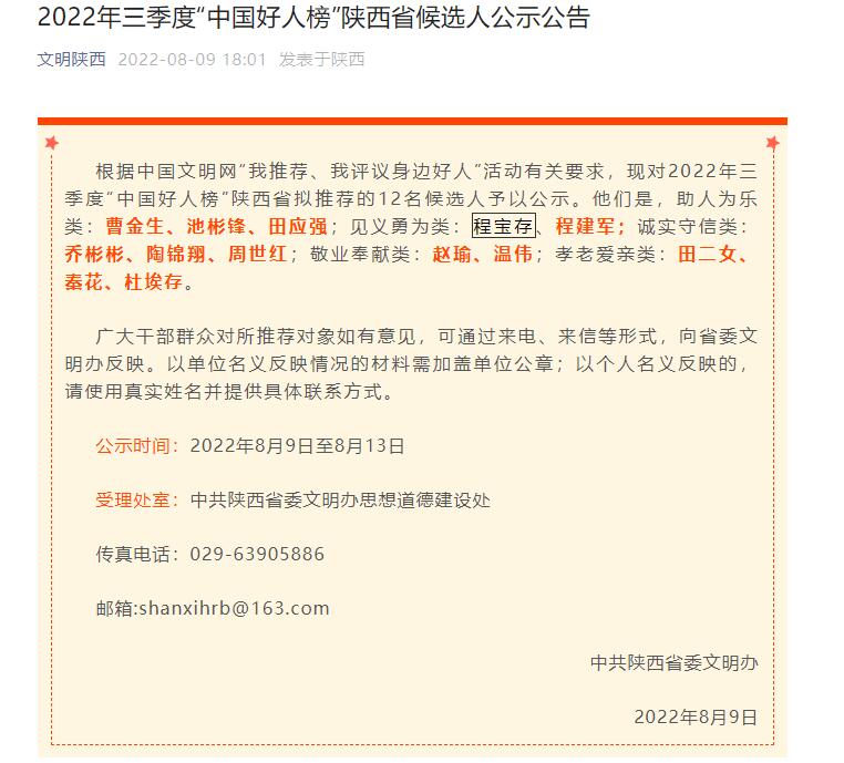 【文明陕西】2022年三季度“中国好人榜”陕西省候选人公示公告