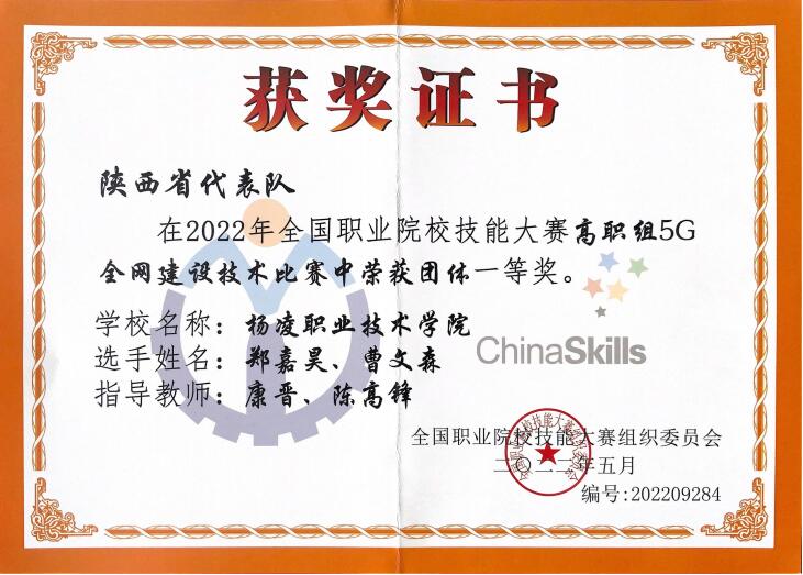 8月22日至23日,2022年全国职业院校技能大赛高职组“5G全网建设技术”赛项在济南职业学院举办,来自全国28个省、56支代表队、112名选手参加了比赛。经过8个小时的激烈比拼,杨凌职院信息工程学院学生郑嘉昊、曹文森以总分排名全国第一的成绩,荣获一等奖第一名,取得自参赛以来历史最好成绩,指导教师康晋、陈高锋荣获大赛优秀指导教师奖。