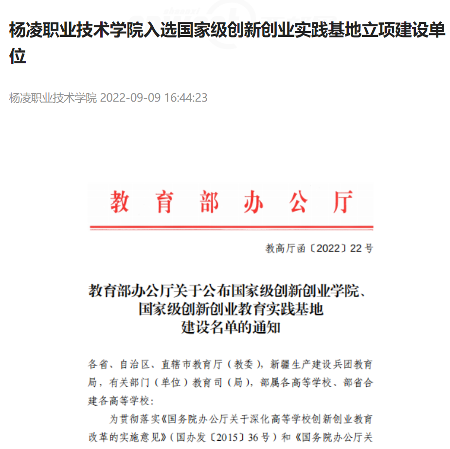 8月31日,教育部公布了国家级创新创业学院、国家级创新创业教育实践基地建设名单,杨凌职业技术学院入选国家级创新创业实践基地立项建设单位,为陕西省唯一入选的高职院校。