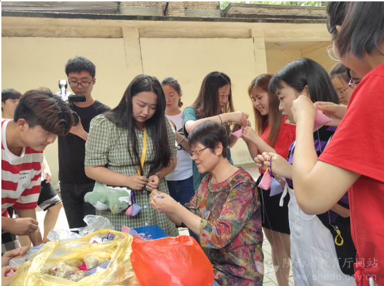传统手工艺人屈惠珍(中)为杨凌职业技术学院师生传授包粽子、做香包的技巧