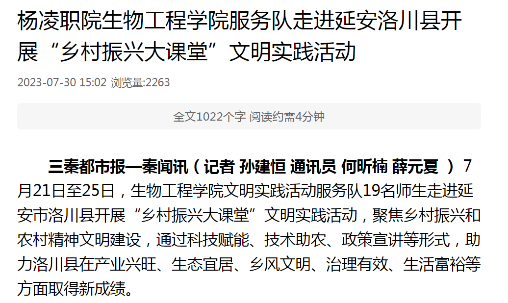 7月21日至25日,生物工程学院文明实践活动服务队19名师生走进延安市洛川县开展“乡村振兴大课堂”文明实践活动,聚焦乡村振兴和农村精神文明建设,通过科技赋能、技术助农、政策宣讲等形式,助力洛川县在产业兴旺、生态宜居、乡风文明、治理有效、生活富裕等方面取得新成绩。