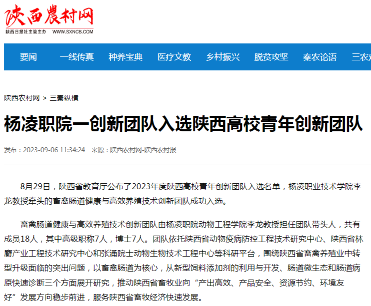 8月29日,陕西省教育厅公布了2023年度陕西高校青年创新团队入选名单,杨凌职业技术学院李龙教授牵头的畜禽肠道健康与高效养殖技术创新团队成功入选。