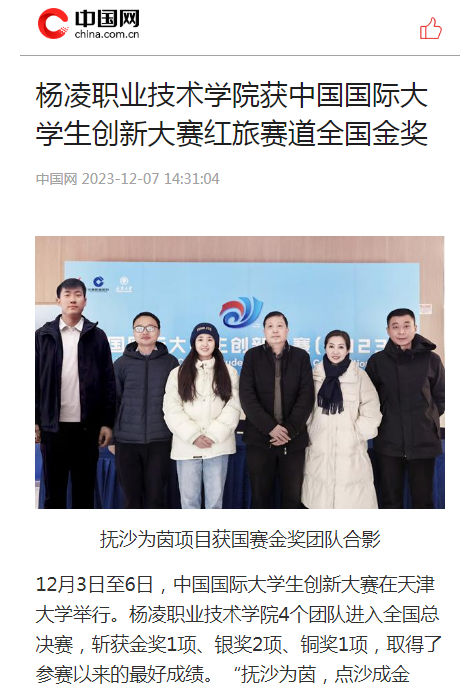 12月3日至6日,中国国际大学生创新大赛在天津大学举行。杨凌职业技术学院4个团队进入全国总决赛,斩获金奖1项、银奖2项、铜奖1项,取得了参赛以来的最好成绩。“抚沙为茵,点沙成金——助力打造荒漠化生态治理新路径”斩获“青年红色筑梦之旅”赛道全国金奖,实现了学校在该赛道金奖“零”的突破,同时在职教赛道、“青年红色筑梦之旅”赛道实现了金奖大满贯,更拿下了陕西省高职院校在红旅赛道的首枚金奖。