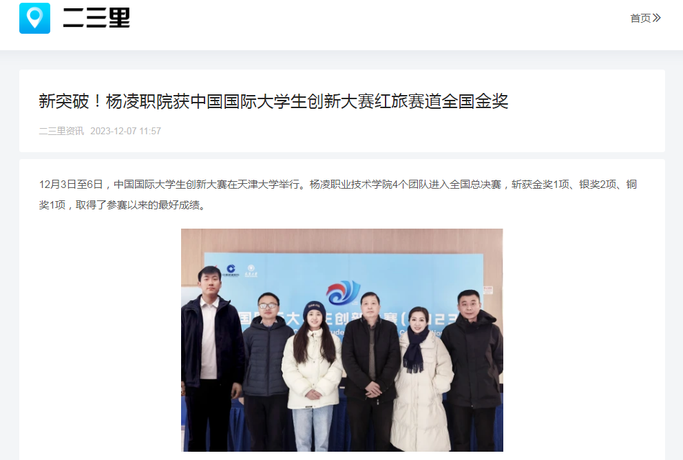 12月3日至6日,中国国际大学生创新大赛在天津大学举行。杨凌职业技术学院4个团队进入全国总决赛,斩获金奖1项、银奖2项、铜奖1项,取得了参赛以来的最好成绩。“抚沙为茵,点沙成金——助力打造荒漠化生态治理新路径”斩获“青年红色筑梦之旅”赛道全国金奖,实现了学校在该赛道金奖“零”的突破,同时在职教赛道、“青年红色筑梦之旅”赛道实现了金奖大满贯,更拿下了陕西省高职院校在红旅赛道的首枚金奖。