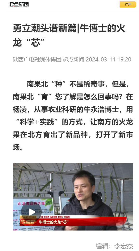 南果北“种”不是稀奇事,但是,南果北“育”您了解是怎么回事吗?在杨凌,从事农业科研的牛永浩博士,用“科学+实践”的方式,让南方的火龙果在北方育出了新品种,打开了新市场。