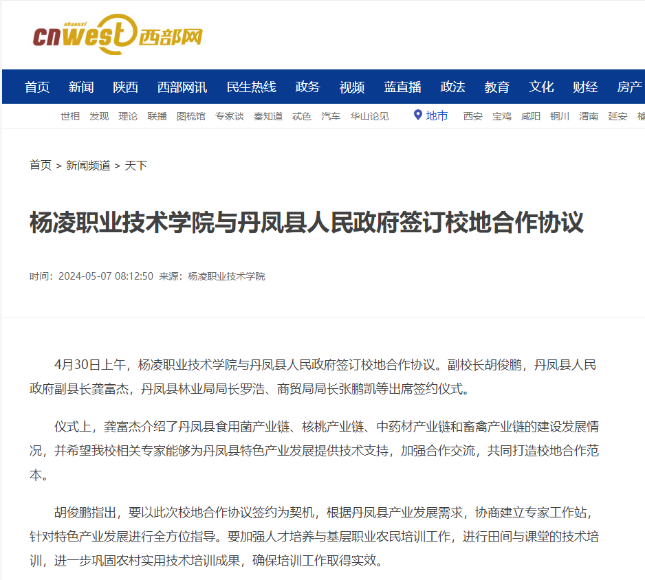 【西部网】杨凌职业技术学院与丹凤县人民政府签订校地合作协议
