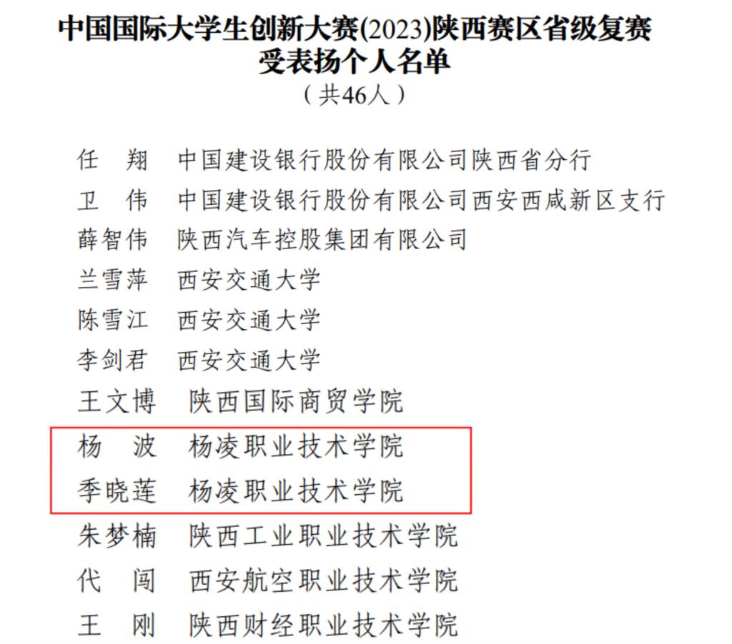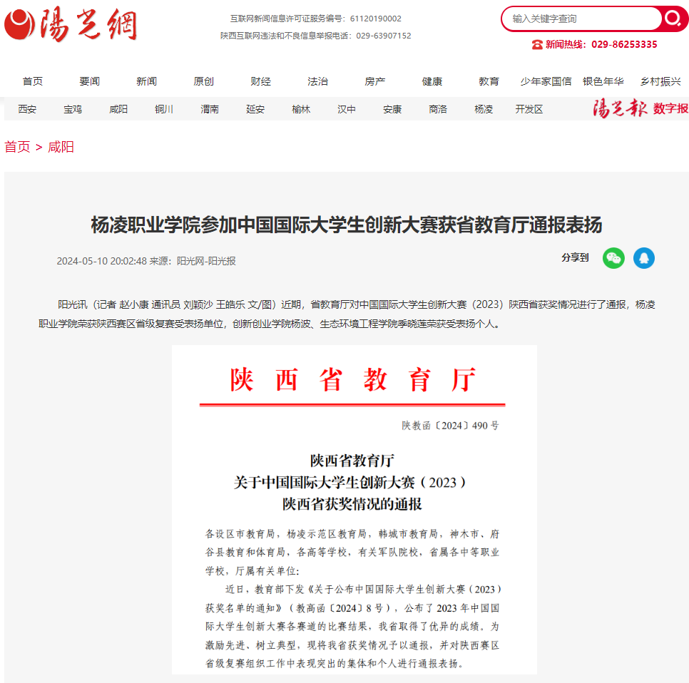 阳光讯(记者 赵小康 通讯员 刘颖沙 王皓乐 文/图)近期,省教育厅对中国国际大学生创新大赛(2023)陕西省获奖情况进行了通报,杨凌职业学院荣获陕西赛区省级复赛受表扬单位,创新创业学院杨波、生态环境工程学院季晓莲荣获受表扬个人。