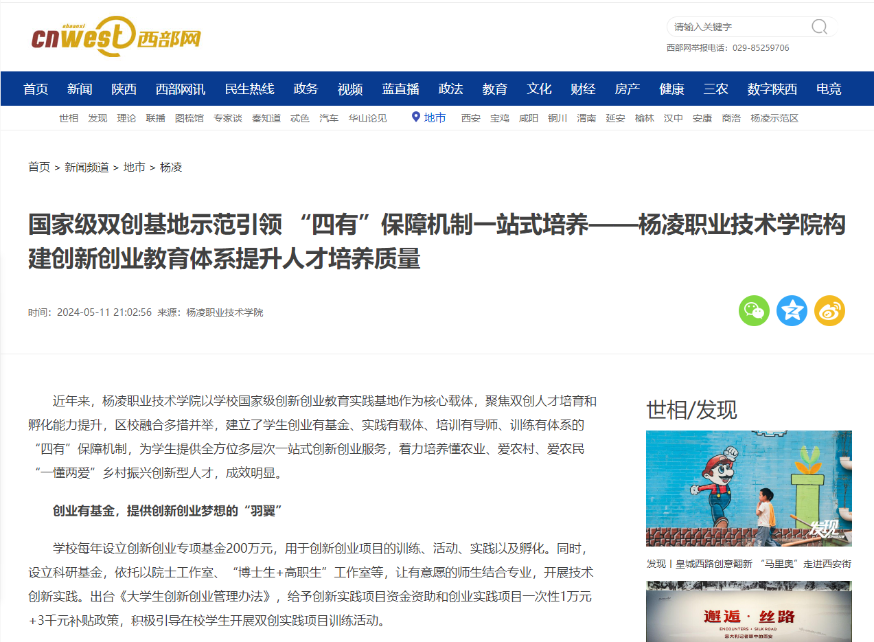 近年来,杨凌职业技术学院以学校国家级创新创业教育实践基地作为核心载体,聚焦双创人才培育和孵化能力提升,区校融合多措并举,建立了学生创业有基金、实践有载体、培训有导师、训练有体系的“四有”保障机制,为学生提供全方位多层次一站式创新创业服务,着力培养懂农业、爱农村、爱农民“一懂两爱”乡村振兴创新型人才,成效明显。