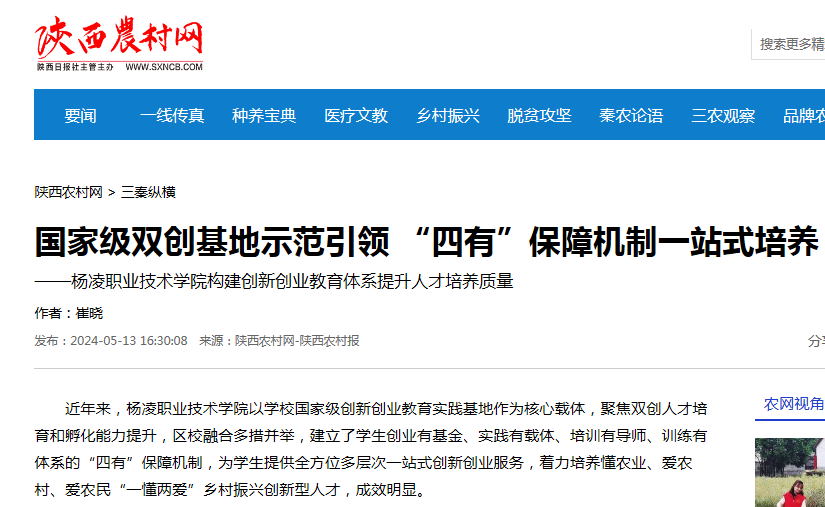 近年来,杨凌职业技术学院以学校国家级创新创业教育实践基地作为核心载体,聚焦双创人才培育和孵化能力提升,区校融合多措并举,建立了学生创业有基金、实践有载体、培训有导师、训练有体系的“四有”保障机制,为学生提供全方位多层次一站式创新创业服务,着力培养懂农业、爱农村、爱农民“一懂两爱”乡村振兴创新型人才,成效明显。