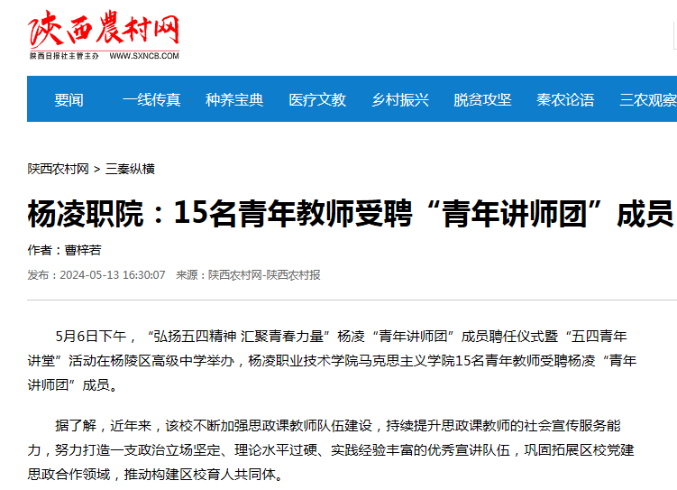5月6日下午,“弘扬五四精神 汇聚青春力量”杨凌“青年讲师团”成员聘任仪式暨“五四青年讲堂”活动在杨陵区高级中学举办,杨凌职业技术学院马克思主义学院15名青年教师受聘杨凌“青年讲师团”成员。