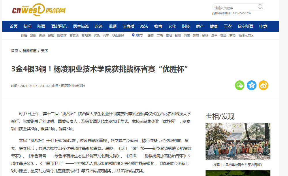 【西部网】3金4银3铜!杨凌职业技术学院获挑战杯省赛“优胜杯”